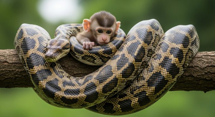 Suddenly, from behind the leaves, the python struck. Its thick body whipped forward, faster than the monkey could react. The baby gave a tiny scream as the snake’s powerful coils wrapped around its fragile body.