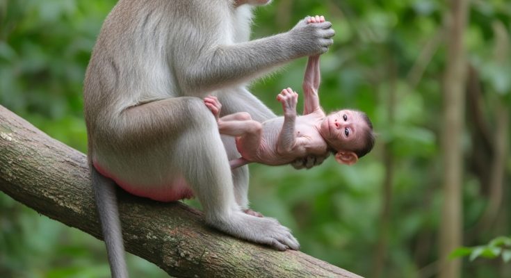 Each step toward the ground made the monkey feel safer. When his feet finally touched solid earth, his legs almost gave out from relief. He stayed close, pressed against the adult’s side, not ready to let go yet.