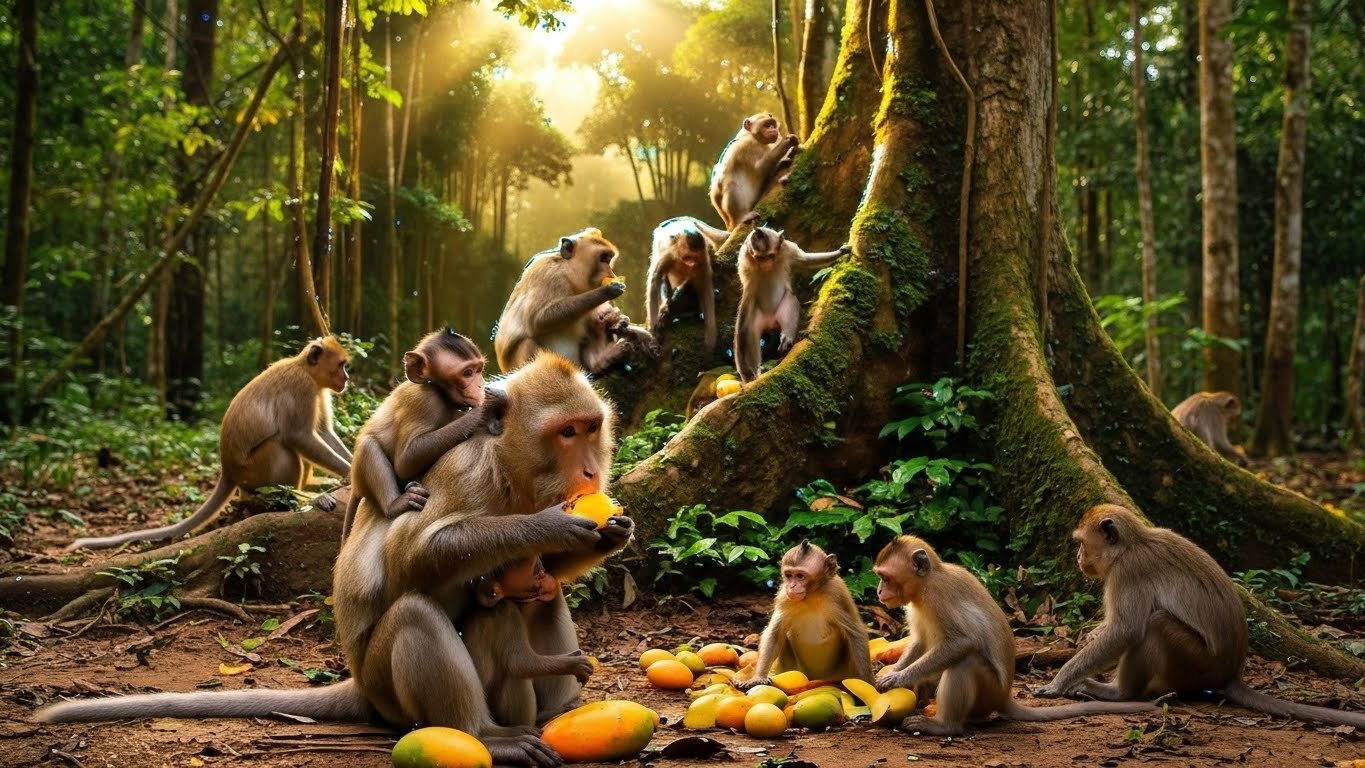 They carried fruit—golden mangoes, glowing berries, sweet roots, and shining nuts that pulsed faintly with magic. Mothers carefully lowered food down using vines. Young monkeys rolled fruits across the ground. Others placed leaves filled with water at the soldiers’ feet.