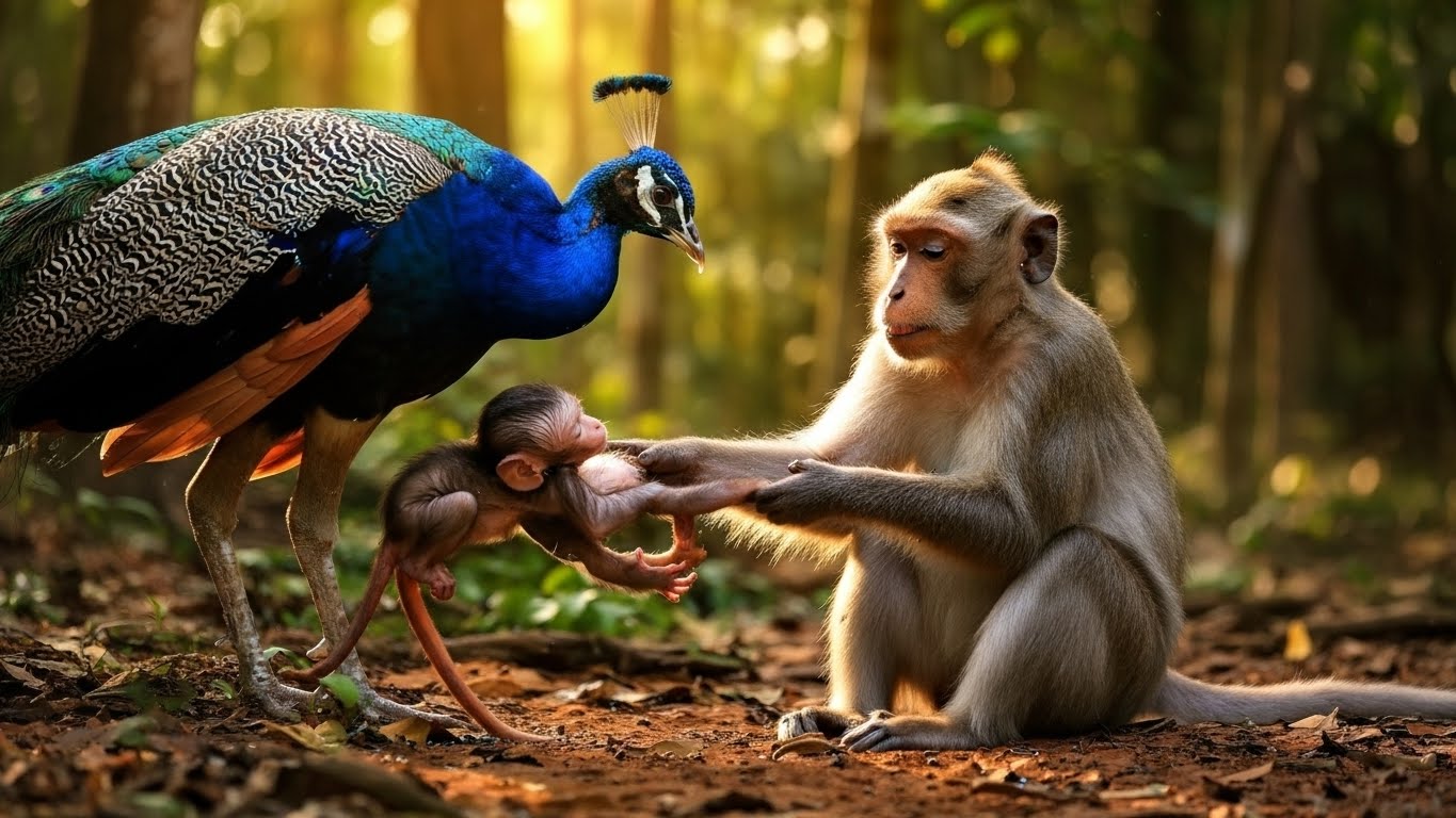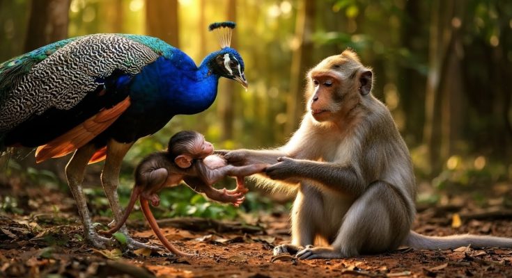 The peacock helped care for the baby monkey when the mother monkey was tired and unable to care for herself. This was not a story the forest expected, yet it unfolded quietly beneath the wide banyan tree at the edge of the riverbank.
