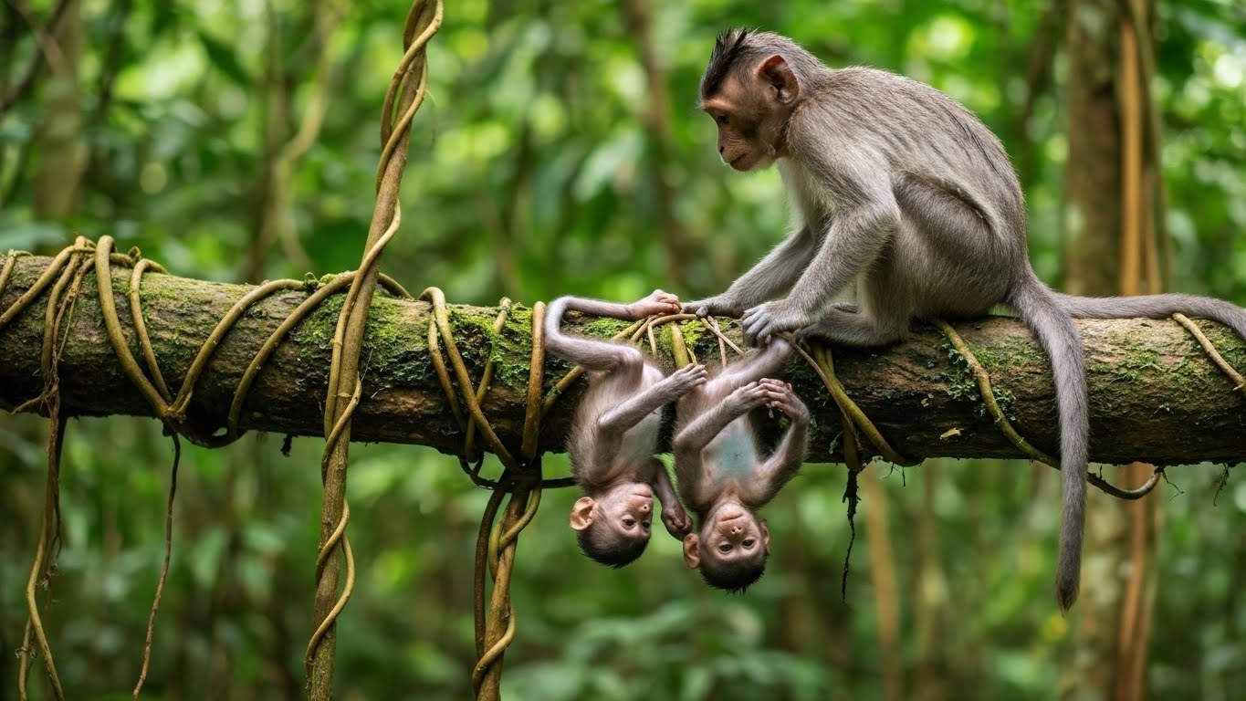 As the first light of morning filtered through the leaves, six newborn monkeys huddled tightly against their exhausted mother, surrounded by the caring arms of the troop.