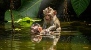 The mother of the newborn was distracted, searching nearby bushes for fruits. The newborn monkey, meanwhile, tried to lift its head but was too weak. Its small cry, soft and faint, blended into the sounds of the forest. That’s when the older baby crept closer, its eyes fixed on the tiny creature. Step by step, it approached the pool edge, its shadow falling over the newborn.