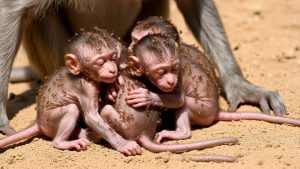 The morning forest was supposed to be peaceful, but instead it held a quiet, terrible danger. On a bed of dried leaves under a tangled branch, two newborn twin monkeys, barely an hour old, lay trembling side by side. Their tiny bodies were still wet from birth, their eyes sealed shut, their breaths thin and fragile.