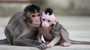 Two baby monkeys sat close together, hugging each other warmly and intimately, as if sharing their strength in a world far bigger than they could understand. Their small bodies were pressed tightly together, fur touching fur, hearts beating fast but slowly beginning to calm. One wrapped thin arms around the other’s back, holding on with surprising firmness, afraid that even a small distance might bring fear back again.