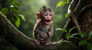 The jungle, usually full of energy and laughter, seemed strange and dangerous to him. The sounds of birds, insects, and rustling leaves only made him more scared. Every noise made him jump. He called again — a weak, high-pitched cry — hoping his mother would come running. But no answer came. Only silence and the sighing wind.
